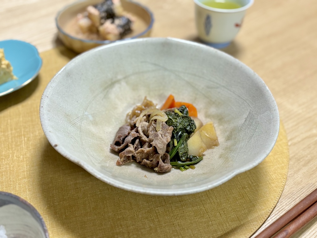This comforting stew harmonizes tender slices of meat, sweet onions, and soft potatoes simmered in a delicate blend of soy sauce, sugar, and mirin.